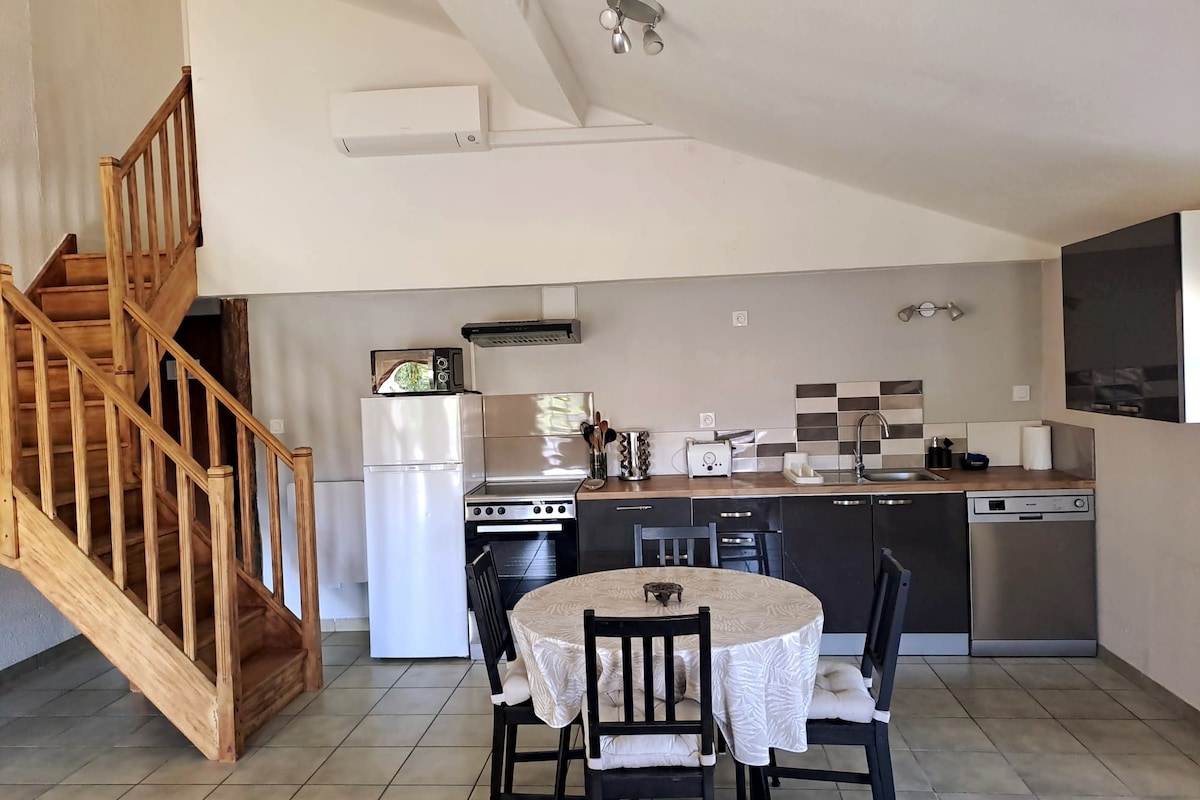 Departamento amueblado compuesto por un dormitorio (con baño y 2 camas) (más sofá cama a pedido con un suplemento de 10 € por la semana) y una cocina-sala de estar totalmente equipada. Con su acceso individual, este lugar cálido rodeado de vegetación le ofrecerá comodidad e intimidad. Lugar de aparcamiento reservado a 10 metros de la entrada. El apartamento es la planta baja de mi casa, soy discreta, pero estoy disponible si me necesitas ;)