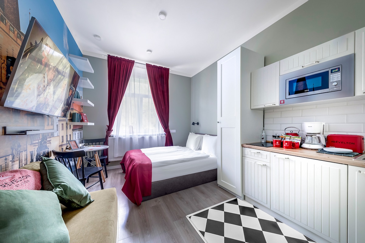 Our cozy aparthotel is located in the heart of the city and offers new apartments with a stylish interior, fully equipped kitchens, modern appliances (for example, High-End TV with Netflix) and much more! We are pleased to inform you that we also have contactless self check-in system. And we will always be in touch through popular messengers, so you can contact us at any time if you have any questions.