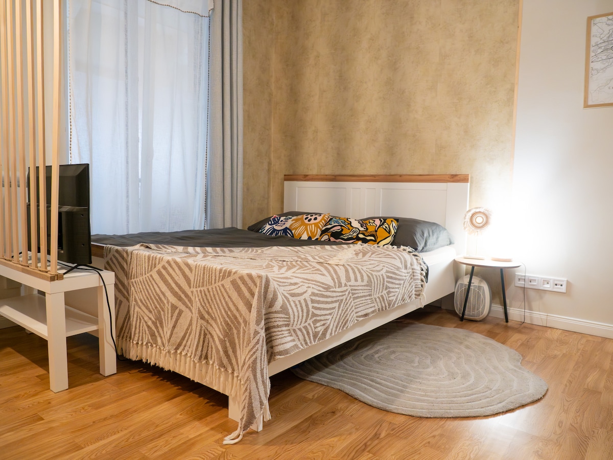 ¡Entra y alójate en nuestro apartamento en la azotea con balcón, ascensor y cocina totalmente equipada! El estudio cuenta con un acogedor balcón, TV inteligente con Netflix, cama tamaño queen y cocina nueva. ¡El barrio está rodeado de lugares de interés gastronómico y los principales lugares de interés están a poca distancia a pie! No solo te proporcionamos el apartamento, sino también guías útiles que hemos creado para ti. Nunca te perderás ni pasarás hambre. ¡Puedes contar con nosotros!