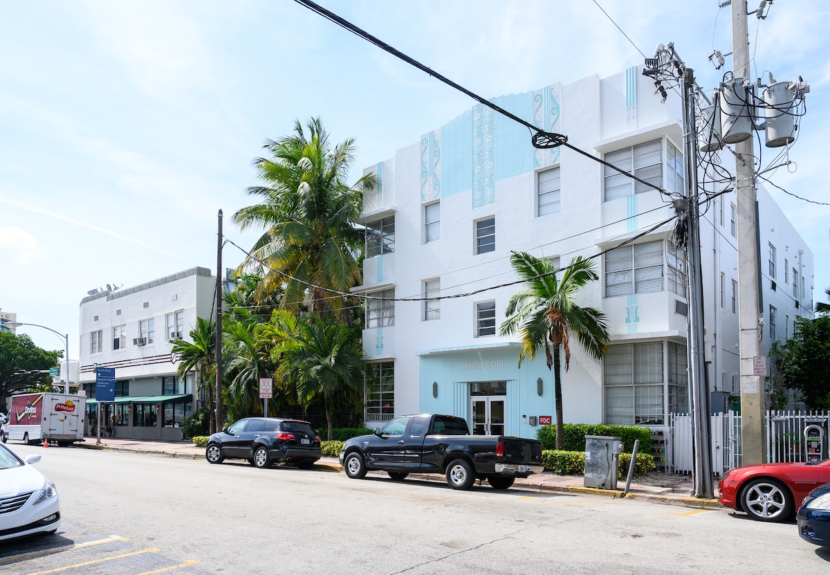 Located on Ocean Drive in a fully restored 1920s Art Deco building, with only 19 units and hotel guidelines for cleaning. Restaurants and shops are outside the building doors. Lummus Park is across the road and miles of white sand beach. 24 hour concierge, so arrive anytime. Very spacious and bright 750 SF unit. High speed unlimited internet + cable TV. King size bed with Hilton mattress, luxurious shower + large bathroom, laundry + full kitchen. Beach chairs, linens and towels provided.