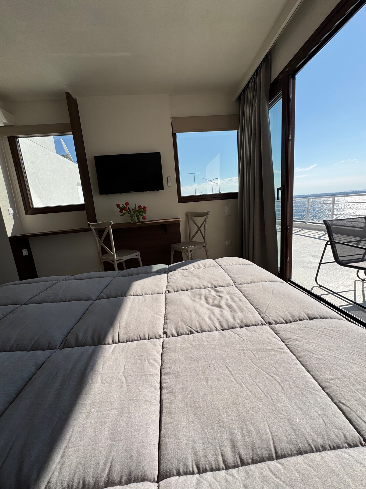 Disfruta de la privacidad y la elegancia de un lujoso apartamento totalmente equipado, de diseño moderno, junto a la plaza Aristóteles. Totalmente renovado con muebles y suministros de primera calidad, equipado con TV y Netflix. Una suite tranquila y soleada ubicada en el quinto piso en el corazón del vibrante centro histórico, con tiendas, restaurantes y cafeterías a solo un minuto de distancia. ¡Disfruta de las vistas al mar desde el hermoso balcón o encuentra placer en dar un paseo por el paseo marítimo que está a la vuelta de la esquina!