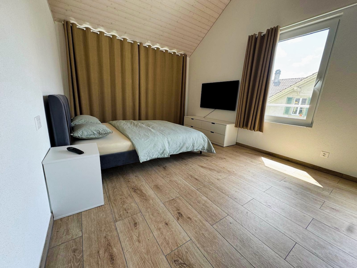 Un apartamento independiente de 2,5 dormitorios (1 cama king, 1 cama queen y 2 camas individuales), renovado en un antiguo chalet suizo, con su propia puerta de acceso y una zona de estar en el jardín bajo un viejo árbol hermoso. Ubicado a 5 minutos a pie de las tiendas y a 10 minutos del centro de Interlaken. El departamento está amueblado y decorado con un estilo lujoso y cómodo.