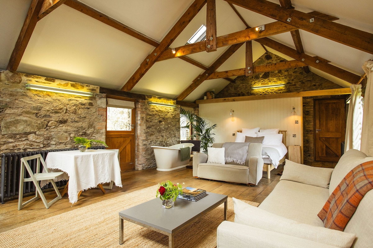 Un espacio tranquilo y profundamente lujoso para recargar energías y reconectar. The Shippon es un establo de vacas meticulosamente convertido con suelos de hormigón pulido y radiante, paredes de color verde oscuro suavemente curvadas, cocina hecha a mano, rincones de lectura cálidamente iluminados y materiales naturales. Mantas de lana, sofá de plumas, estufa de leña escandinava antigua, cama tamaño king con sábanas y edredón franceses, ducha de cascada y las toallas más suaves. Nuestra tranquila aldea de Devon solo está iluminada por las estrellas por la noche. Es posible que duermas mejor de lo que has dormido en años.