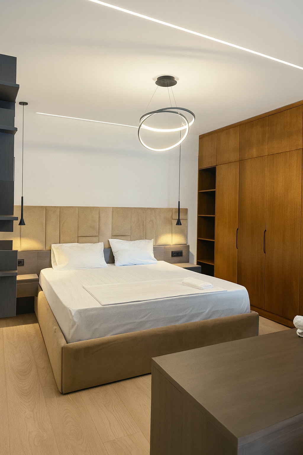 Gran apartamento en el corazón de Tirana, con excelentes vistas, iluminación natural y con una amplia terraza en la planta superior desde la que se puede ver la ciudad (por la noche el cielo es mágico). Un diseño moderno con un toque de calidez de madera y habitaciones amplias. Situado a solo 4 minutos a pie del centro y con conexión a través de todas las calles principales de Tirana hace de este apartamento una buena elección para los huéspedes que quieran experimentar la cultura de la ciudad museos, parques, restaurantes y la vida nocturna de Tirana.