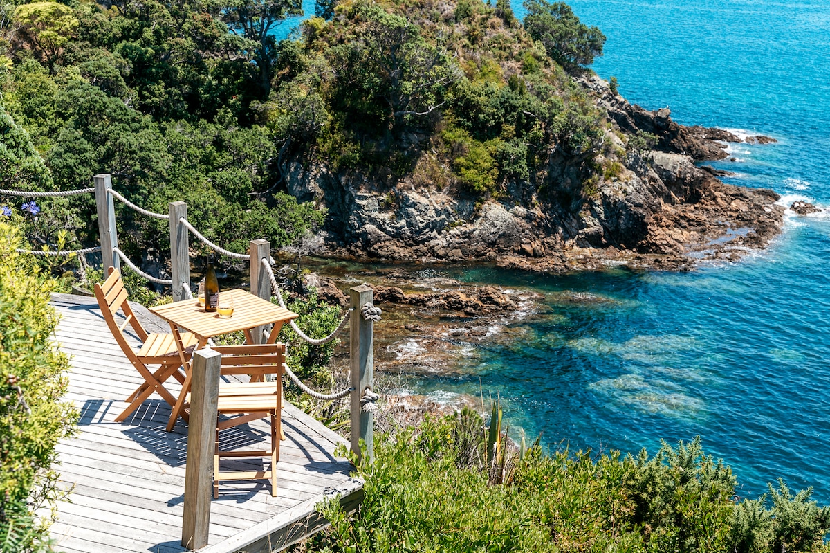 Te enamorarás al instante de Lover's Point. En el momento en que llegues a la impresionante cabaña en la cima del acantilado, las vistas te dejarán sin aliento, sin importar la dirección en la que mires. De pie en la cubierta, déjate hipnotizar por las vistas ininterrumpidas de Coromandel, The Noises, la bahía de Oneroa e incluso hasta la isla Gran Barrera. Entra en la cabaña y sigue conectado íntimamente con las vistas. Al alojarte en Lover's Point, estarás en la cima del mundo, pero a un mundo de distancia de todo.