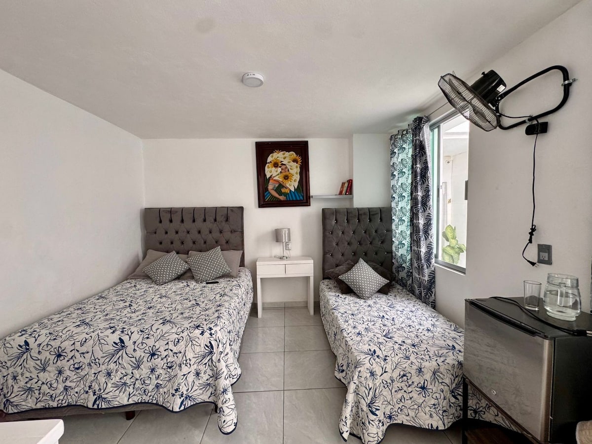Este espacio, es excelente para estancias largas o cortas, cuenta con todo lo necesario para tu comodidad, cocina equipada, bien iluminado, son dos recamaras, en una se encuentra la cocina, estudio y televisión, tiene un balcón lleno de plantas, con una hamaca super cómoda para la siesta, un pequeño comedor. En esta recamara contamos con un futon que se hace cama matrimonial. La segunda recamara tiene unos sillones y la cama principal que es también matrimonial.