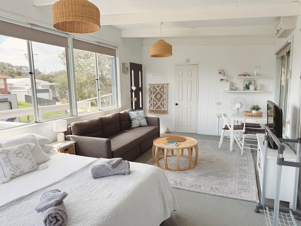 *NUEVO ANUNCIO* Ubicada en una ubicación tranquila y privilegiada, en el corazón de Rye. Ropa de cama incluida. La cabaña Blue Beach es una casa de huéspedes en la playa renovada que cuenta con un dormitorio de estilo estudio de planta abierta, con una cocina/comedor independiente y un baño independiente. Esta encantadora propiedad es luminosa y espaciosa, acogedora y cómoda, ¡perfecta para una escapada en pareja o una familia con un bebé o un niño pequeño! En una ubicación privilegiada en Rye con fácil acceso a la playa, tiendas y aguas termales. Es un entorno muy tranquilo.