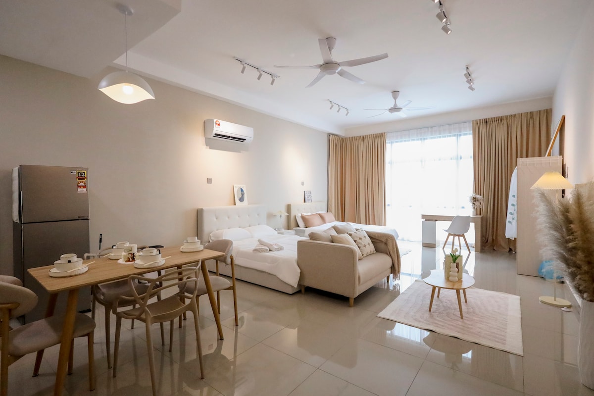 Our unit designed with white & black concept, nearby Toppen Ikea, Aeon Tebrau, Mount Austin trendy cafes and Johor Jaya Street food vendors and restaurants . We provide: *500Mbps high-speed WiFi *fully air-conditioned (5 units aircon) *karaoke & TV box system (Jazpiper) *65inch smart TV *mahjong set & table *board games *simple kitchenware *SK Magic water purifier *towels *shampoo *body wash *coffee & tea