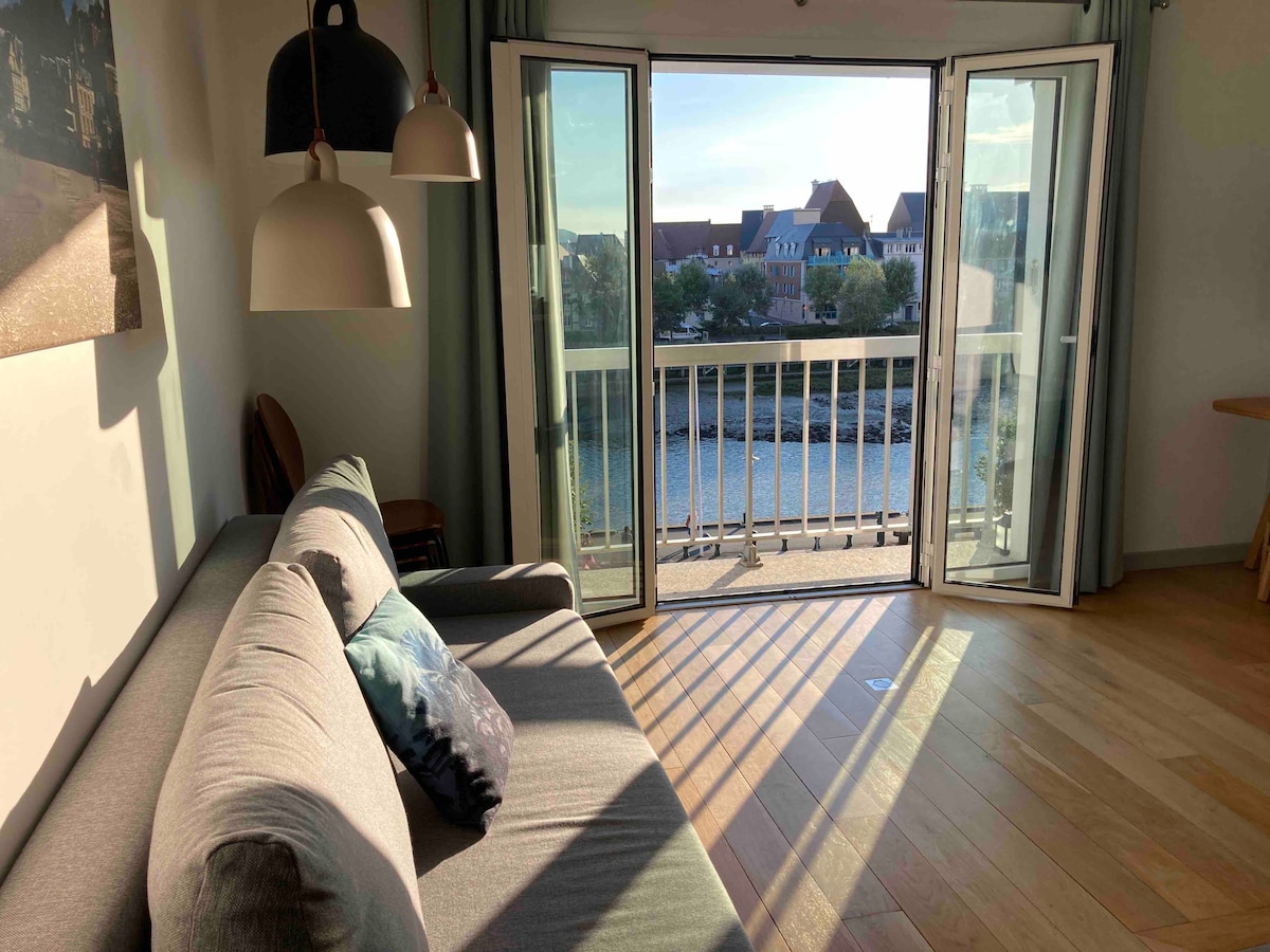 Disfrute de nuestro estudio con balcón orientado al sur y bañera de hidromasaje en la Marina. Está equipado con una cama real de 160x200 con sábanas de lino, wifi, TV conectada, cocina equipada con lavavajillas, cafetera de granos orgánicos con molinillo, té orgánico y sodastream, 1 botella de sidra local fresca de regalo, wifi. Relajación asegurada en el baño equipado con una bañera de hidromasaje para una persona. Los inodoros están separados. Hay un estacionamiento gratuito al pie del edificio.