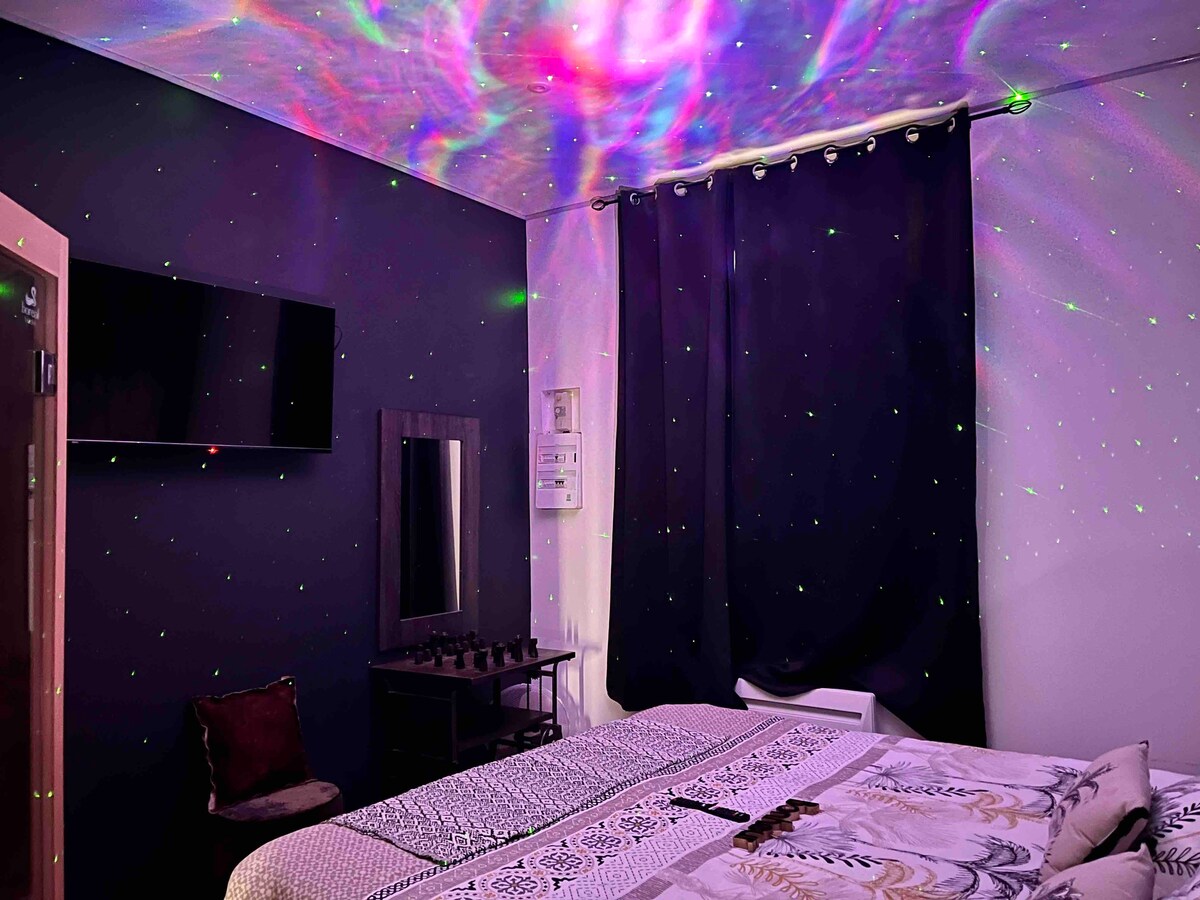 Bienvenue dans ce nid douillet saumurois, conçu pour que vous passiez un moment de bien-être complet avec jacuzzi extérieur, sauna, douche - hammam, avec mini jets hydromassants. Vous pourrez également profiter d'une petite terrasse. Savourez un film depuis le confort de votre lit via le rétroprojecteur avec barre de son, Netflix, Disney & Prime vidéo. Personnalisez les couleurs des spots et du ciel étoilé ou encore allumez la petite cheminée électrique pour un véritable instant cocooning.