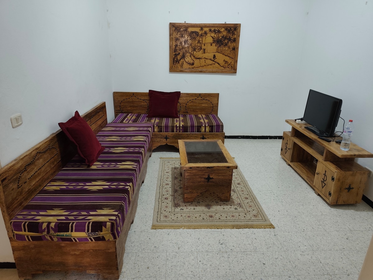 The apartment is located in a quiet neighborhood, on the first floor. It has been recently renovated and boasts an oriental-style finish. It consists of two separate bedrooms, a kitchenette with a living room, a bathroom, and a balcony, which is accessible from both the master bedroom and the living room. Guests can take advantage of the tour and attraction itinerary, as well as fantastic Tunisian dishes delivered to the apartment upon request.