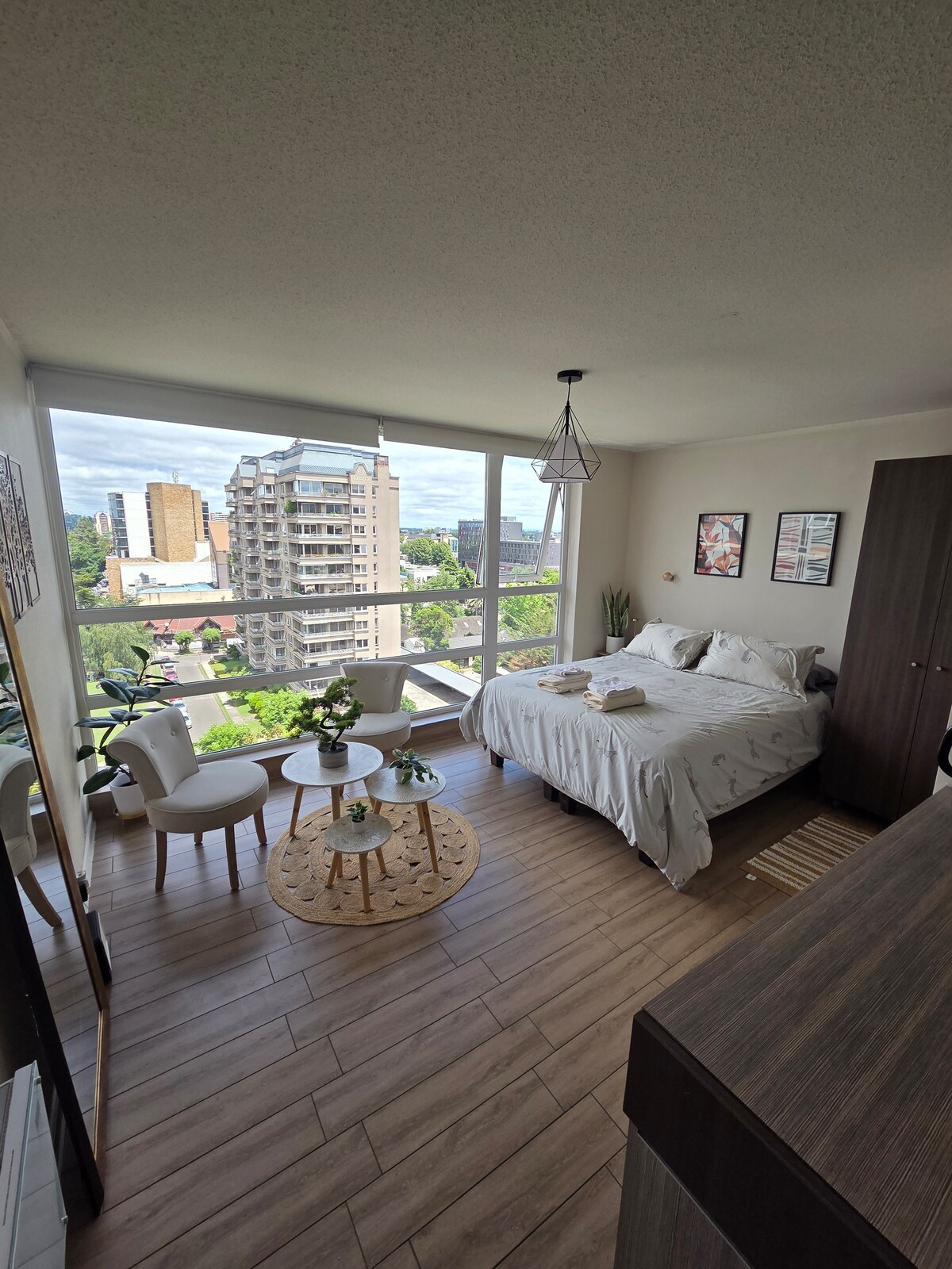 Moderno departamento estudio en piso 10 con hermosa vista a Temuco. Ubicación privilegiada: stripcenter en el edificio y a pasos del Casino Dreams, Mall Portal Temuco, bares, restaurantes, cafeterías, museos y servicios. Cuenta con cerradura digital, cocina equipada, cama de 2 plazas, calefacción eléctrica y wifi. Check-in 15:00 hrs, check-out 11:00 hrs. Consulta por horarios especiales.
