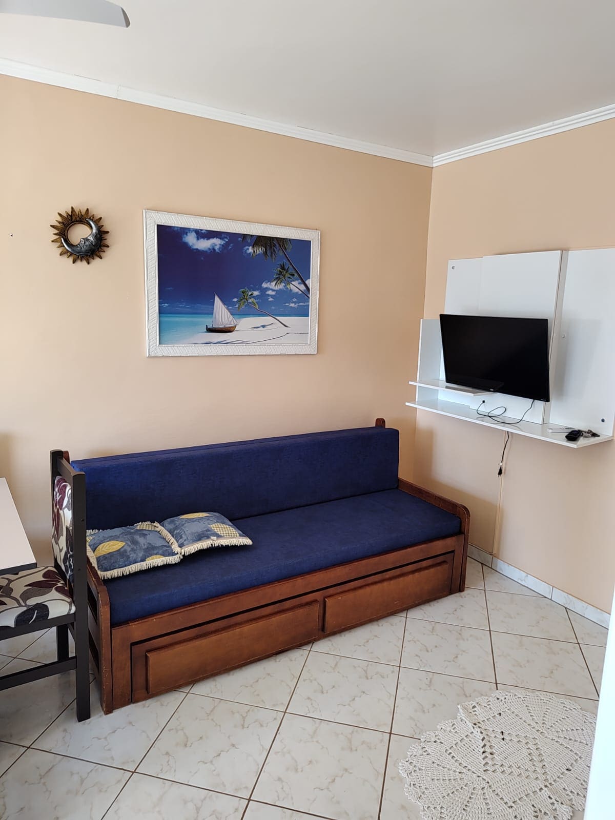 Apartamento frente al mar, un dormitorio, totalmente amueblado, con garaje cerrado, vista a la ciudad. Cerca del centro, supermercados, solo cruzar la calle para llegar al mar. Cama doble en el dormitorio, colchón doble extra y un colchón individual. ¡El espacio de estacionamiento tiene capacidad para un coche mediano!