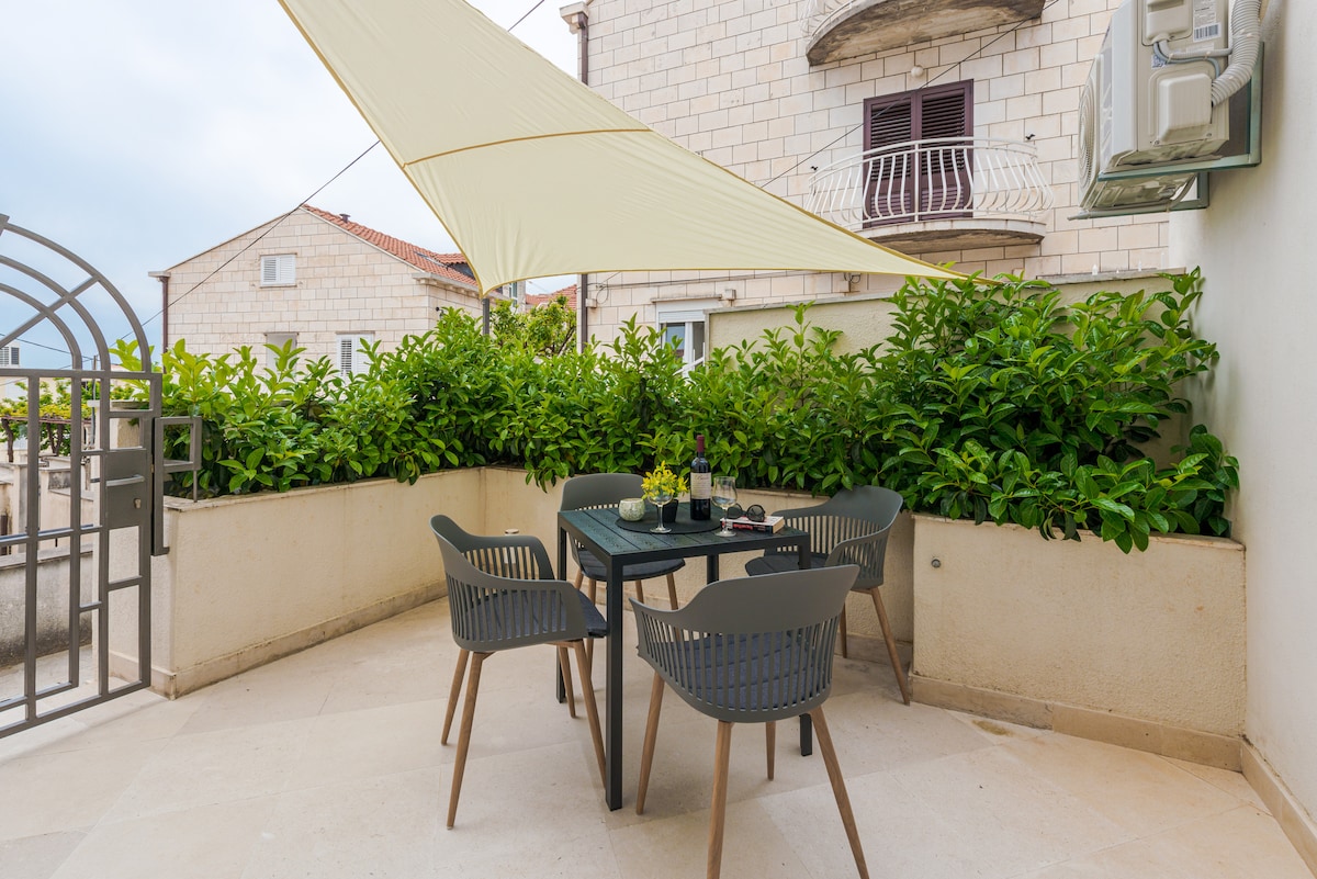 This modern, spacious, bright and cosy apartment lies on the ground floor of the traditional stone house in the most desirable part of the town known as Ploce. A garden of orange trees and a private terrace with dining, lounge and sunbed area, provide breathtaking views overlooking the Adriatic sea and Old town of Dubrovnik. Just a few minutes walk from the Old Town, the apartment is far away from busy streets and noise just enough to be the oasis of peace and tranquillity.