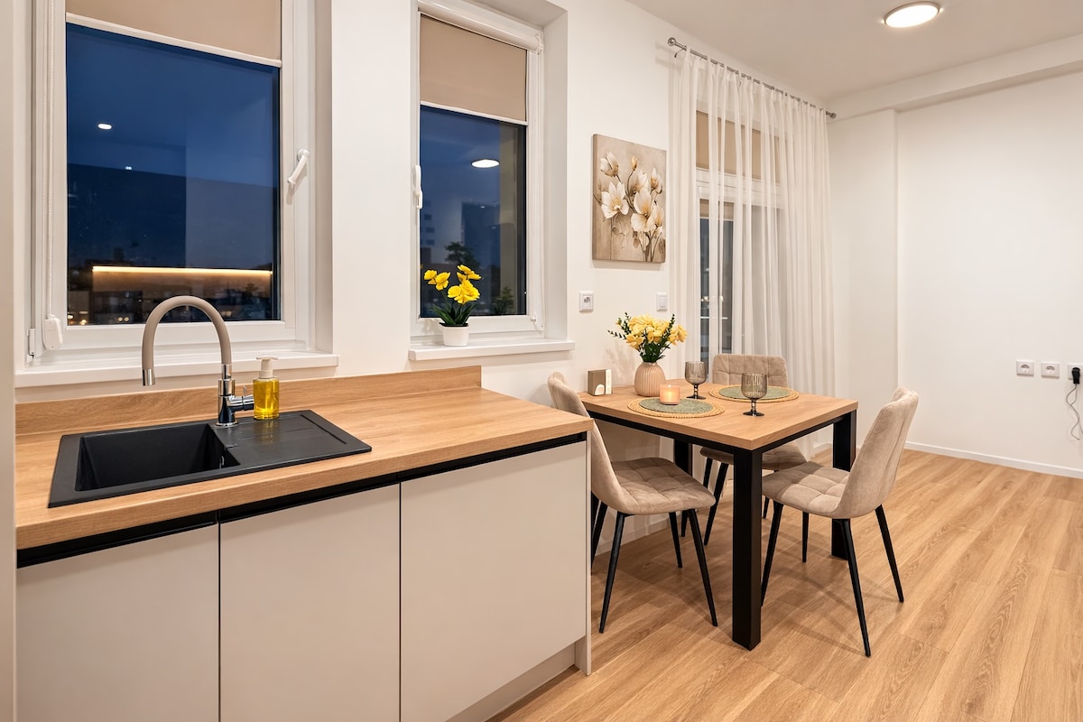Byt je pohodlný a prakticky zariadený, pripravený pre vaše pohodlie. Má všetko, čo potrebujete na bezstarostný pobyt: kompletne vybavenú kuchyňu, kúpeľňu, Wi-Fi a TV. K dispozícii máte bezplatné parkovanie v súkromnom areáli priamo pri byte. Byt sa nachádza v pohodlnej oblasti, v bezprostrednej blízkosti veľkého Tesca a čerpacej stanice Shell.