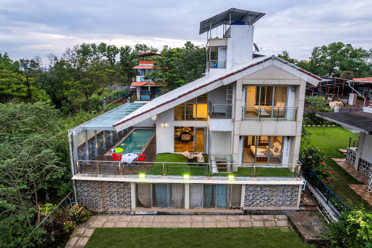 Tucked in Relax County, this 3-BHK villa is surrounded by misty hills, cascading waterfalls, & lush greenery, offering a peaceful countryside retreat.Each bedroom has a balcony with garden views, & the master suite includes a bathtub for leisurely soaks. Outdoors, enjoy a private pool, lush green lawn with poolside dining, & a garden with a trampoline, all boasting 360° panoramic hill views.Located 6 km from Ashoka Waterfall, 12 km from Igatpuri Lake Viewpoint, and 14 km from Camel Valley Point.