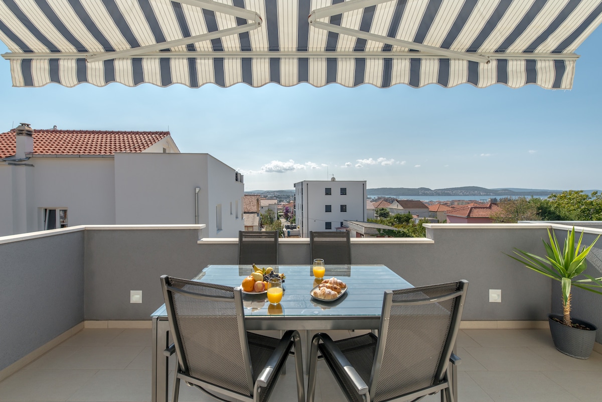 El apartamento se encuentra en el tranquilo y exclusivo barrio residencial de Zenta, en un pequeño edificio en el tercer y último piso. El edificio está en la línea de costa con vistas al puerto deportivo, las playas y las islas circundantes. Ofrece un gran balcón amueblado de 100 m2 con bañera de hidromasaje. El palacio de Diocleciano, protegido por la UNESCO, está a unos 2,5 km.