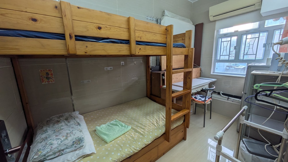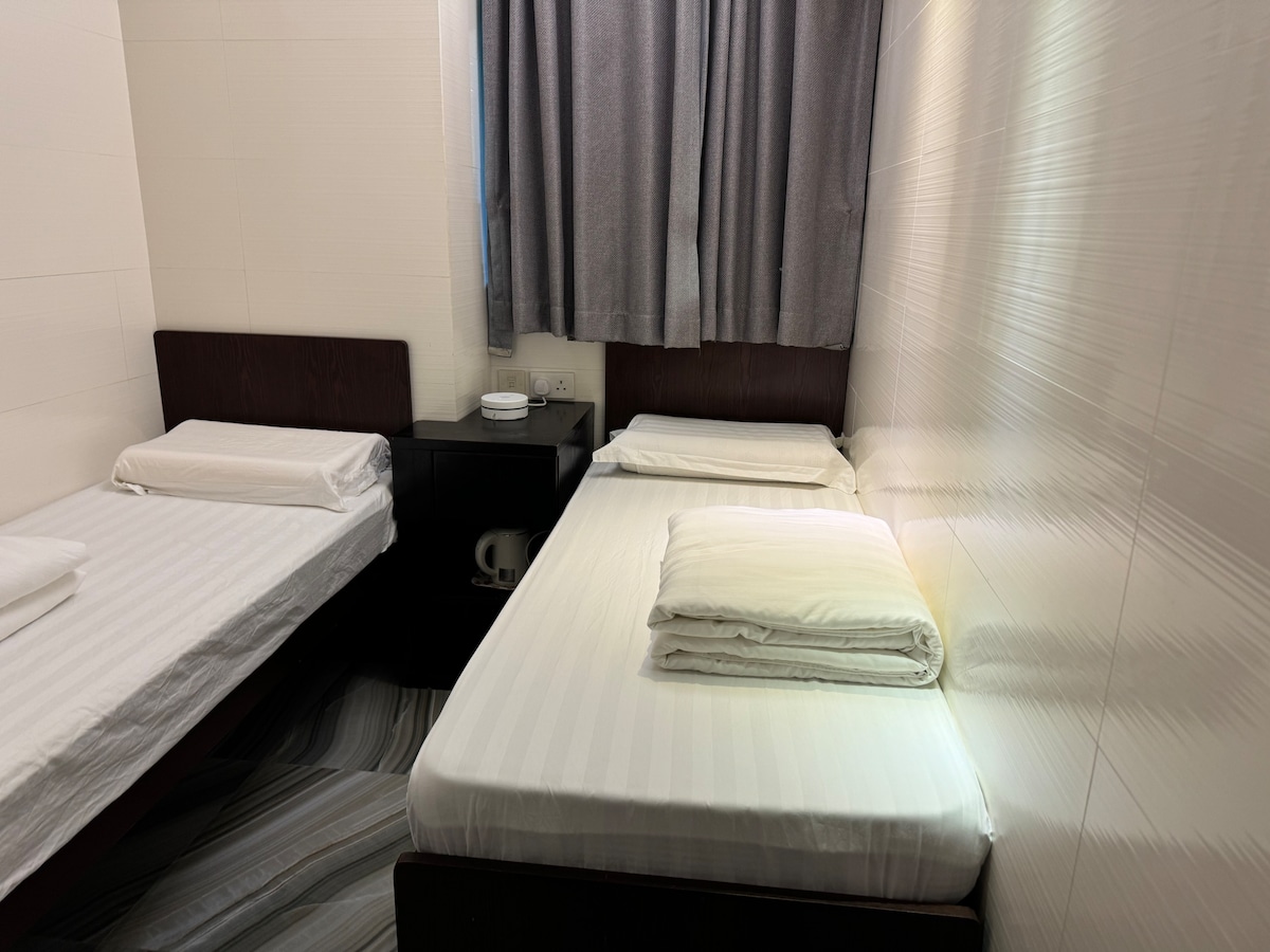 It is a cozy and comfortable room that can accommodate two people. The room is furnished with two single beds, and a study desk. There is a large window that lets in plenty of natural light. The en suite bathroom is equipped with a shower, toilet .This room is ideal for two friends or siblings traveling together who would like an affordable private space to stay.地點優越,前往熱門商店和餐廳非常便捷。