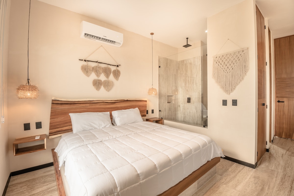 Unveil contemporary luxury at our new jungle condo. With expansive windows and double-height ceilings,this unit is bathed in natural light, creating a unique and inviting atmosphere.Relax in the king-size bed overlooking the social area or step outside to your private swim-up pool.Take the elevator to Tulum's #1 rooftop terrace for stunning views.Enjoy 200 mb internet and a central location between downtown Tulum and the beach,ideal for exploring shops, dining, and the beautiful beaches of Tulum