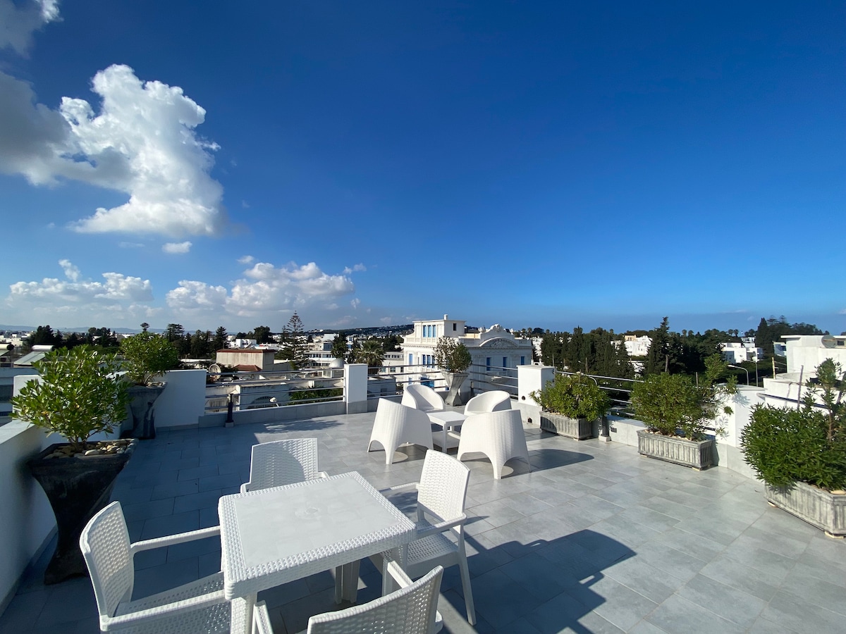 Situé en plein cœur de La Marsa sur l’Avenue Habib Bourguiba. Un emplacement centrale! Un Duplex de haut standing décoré avec gout alliant modernité et authenticité. Un Rooftop avec une vue Imprenable pour contempler le soleil se coucher sur la ville. Vous serez à quelques minutes à pied de la plage, des Restaurants, parc, cinéma, centre commercial et toutes commodités. Une internet très haut débit en wifi 5G et tous les équipements pour répondre à un niveau d'exigence et de confort très élevé.