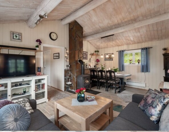Moderna casa de campo de 189 m2 con una ubicación única sin vecinos, a 10 metros del lago Sølisjøen ("Sellisjøen") en Tydal. 1:45h de Trondheim. 5 dormitorios con 5 camas dobles y 2 camas individuales. Todos los servicios, 2 baños, lavandería, sala de estar loft, TV, TV, TV, wifi. Mesa larga con espacio para 12 personas, silla alta. Terraza de 60 m2, chimenea, parrilla de gas. Costa privada a 5 metros de las aguas de natación y pesca. A 3 millas de pistas de esquí arregladas a pocos 100 metros de la cabaña. Plaza de estacionamiento a poca distancia de la cabaña, 250 metros para caminar en verano, 700 metros en invierno.