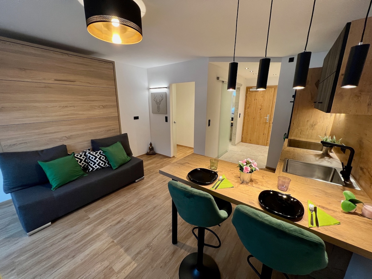 En la categoría Junior Suite con vistas a la montaña, le espera un apartamento de más de 30 m² para un máximo de tres personas con cama doble king size y un sofá cama individual de alta calidad. El apartamento dispone de una cocina totalmente equipada con una acogedora sala de estar, un lujoso baño con una ducha extragrande y una secadora, así como una terraza de 10 m² con suficientes asientos para disfrutar de un delicioso desayuno al aire libre con unas vistas maravillosas de las montañas tirolesas.