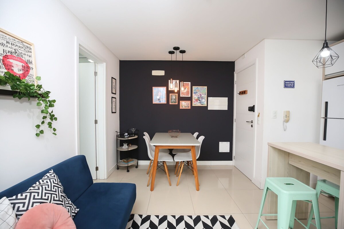 Nuevo estudio, decorado con muebles modernos, en Espaço Viva Trindade, Torre Apart, junto a UFSC, frente al Hospital Universitario y cerca de Shopping Villa Romana. En el desarrollo, el huésped tiene acceso a restaurantes, cafés y bares en el Food Hall, así como a un supermercado en la planta baja. Ideal para parejas, estudiantes, profesionales y familias con niños pequeños. Este alojamiento único tiene un estilo acogedor y cálido, para que los huéspedes se sientan como en casa.