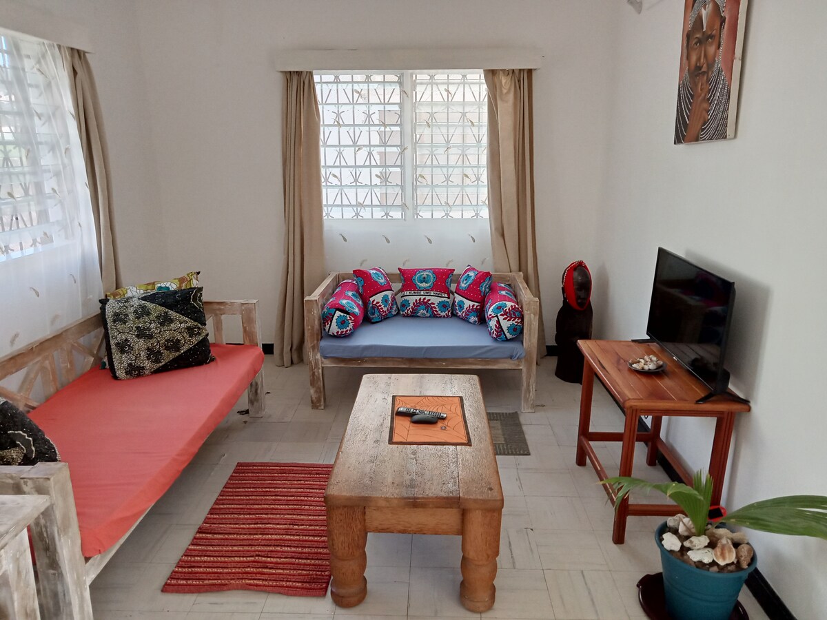 Una casa de 1 dormitorio con una decoración interior sencilla y minimalista en el centro de Diani. Amplia, luminosa y perfecta para estancias cortas o largas. Un cómodo sofá cama grande en la sala de estar, TV inteligente de pantalla plana, wifi rápido y un comedor que se puede utilizar como mesa de estudio/trabajo. Una cocina totalmente equipada, cama tamaño queen en el dormitorio, un baño limpio equipado con toallas y artículos de aseo. Techo alto con ventiladores de techo, ventiladores de pie adicionales, deshumidificador y grandes ventanas de vidrio con persianas para la circulación del aire.