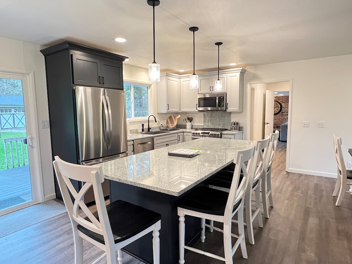 Casa de campo moderna en el lago Sammamish: 2 dormitorios/2 baños con aire acondicionado y chimenea a gas. Ambos dormitorios cuentan con edredones y almohadas mullidos. Disfrutá de pisos de madera, una cocina bien equipada con electrodomésticos nuevos, lavarropas y secarropas, comedor para 6 personas, sofá cama, TV de 55” y barra de café. Relajate con una cena con vista al lago, hacé kayak en la costa o explorá el sendero del lago Sammamish, que está justo al lado de tu puerta. ¡Los perros bien educados son bienvenidos!