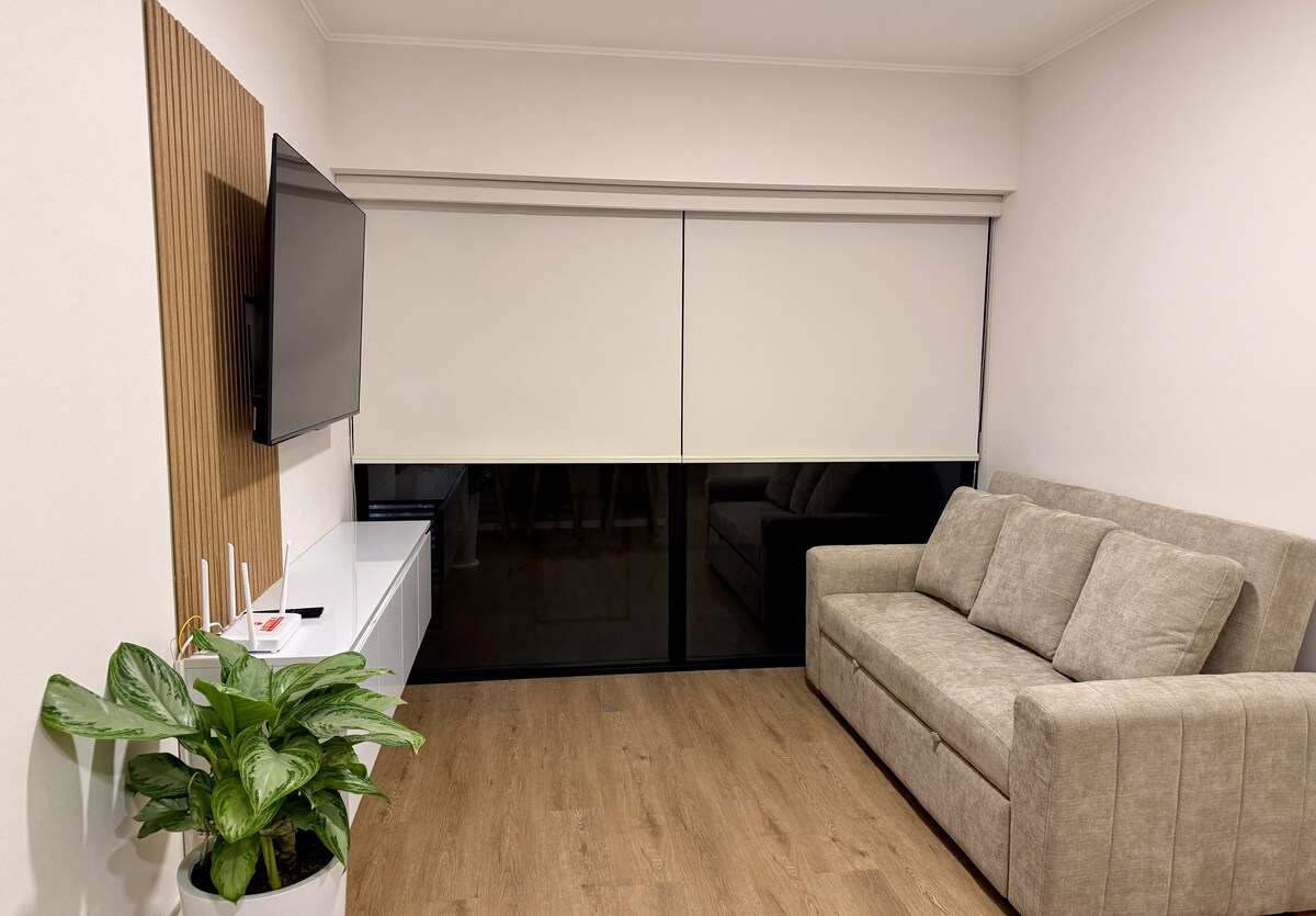 Departamento moderno con balcón y vista panorámica de la ciudad. Disfrutá de un televisor inteligente de 55 pulgadas con Netflix y Disney+, wifi rápido, una cocina totalmente equipada con filtro de agua y estación de café espresso. Cama queen, lavarropas y secadora, espacio de oficina en casa, llave inteligente y check-in sin restricción de horario. Perfecto para el trabajo remoto, viajes de negocios o estadías largas.