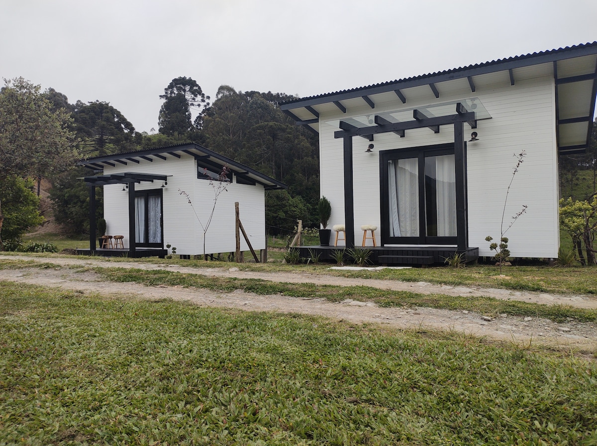 Cabanas de 82 m² com 2 suítes completas e confortáveis em um lugar sossegado na natureza, porem próximo 3 km do centro comercial e de plantações. Cozinha com geladeira, fogão, forno, micro-ondas, mesa de jantar, churrasqueira e todos os utensílios básicos de cozinha inclusive taças. Suítes com ar condicionado quente e frio, armários, roupas de cama e de banho Altenburg e vista para a natureza. Sala com sofá, televisão 32" com canais a cabo, Wi-fi de qualidade e calefator para aquecer.