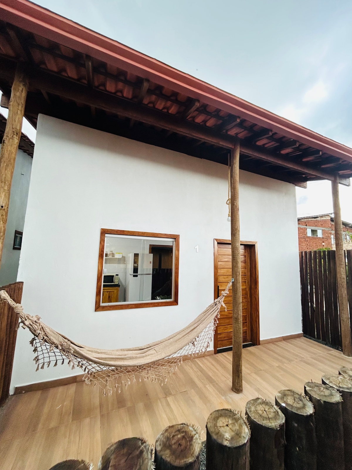 Encante-se com esta charmosa suíte de 18 m², um refúgio de tranquilidade e bem-estar em meio à natureza. Privativa e independente, possui cama queen com mosquiteiro, ar-condicionado, iluminação natural e varanda com rede. Decoração rústica e artesanal, criada pelo proprietário, e espaço de trabalho com boa internet. A cozinha externa é equipada, incluindo churrasqueira. Sustentável, com aquecimento solar e separação de resíduos, além de ducha externa para maior comodidade após a praia.