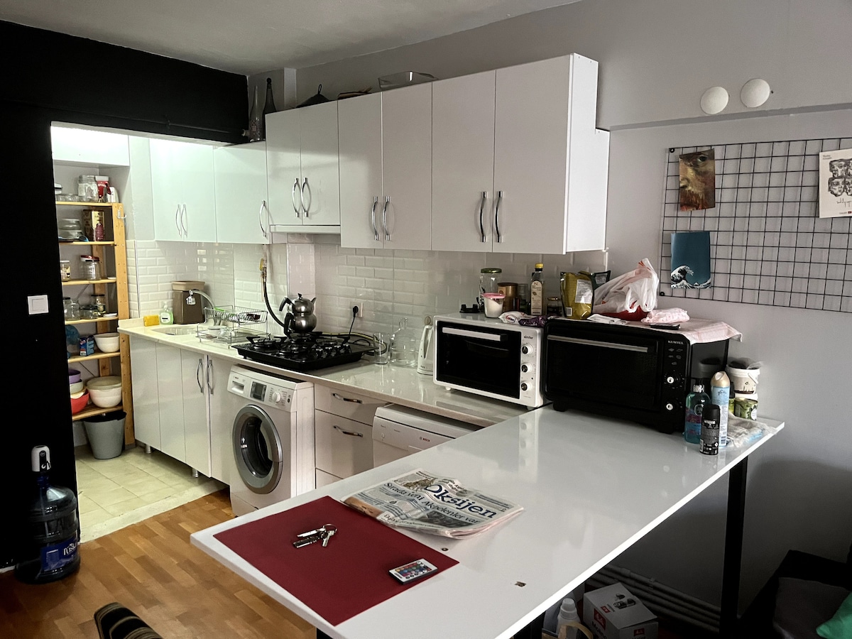 Hay 2 habitaciones en la casa: 1 sala de estar y 1 dormitorio. Puedes acceder fácilmente a todo un grupo desde este lugar céntrico. Está a 3 minutos a pie de los vehículos de transporte público, como el metro, el metrobús y Marmaray. Está a 10 minutos a pie del mar. Con una televisión inteligente de 65 pulgadas y una infraestructura de internet de 200 mbit, podés hacer tu trabajo en el área de trabajo y hacer tus deportes diarios en el área deportiva. Puedes preparar tu propia comida con el equipo de cocina.