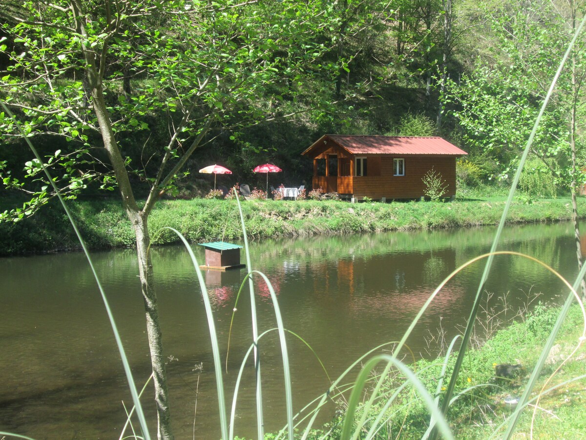 Cabaña a orillas de un estanque y un río