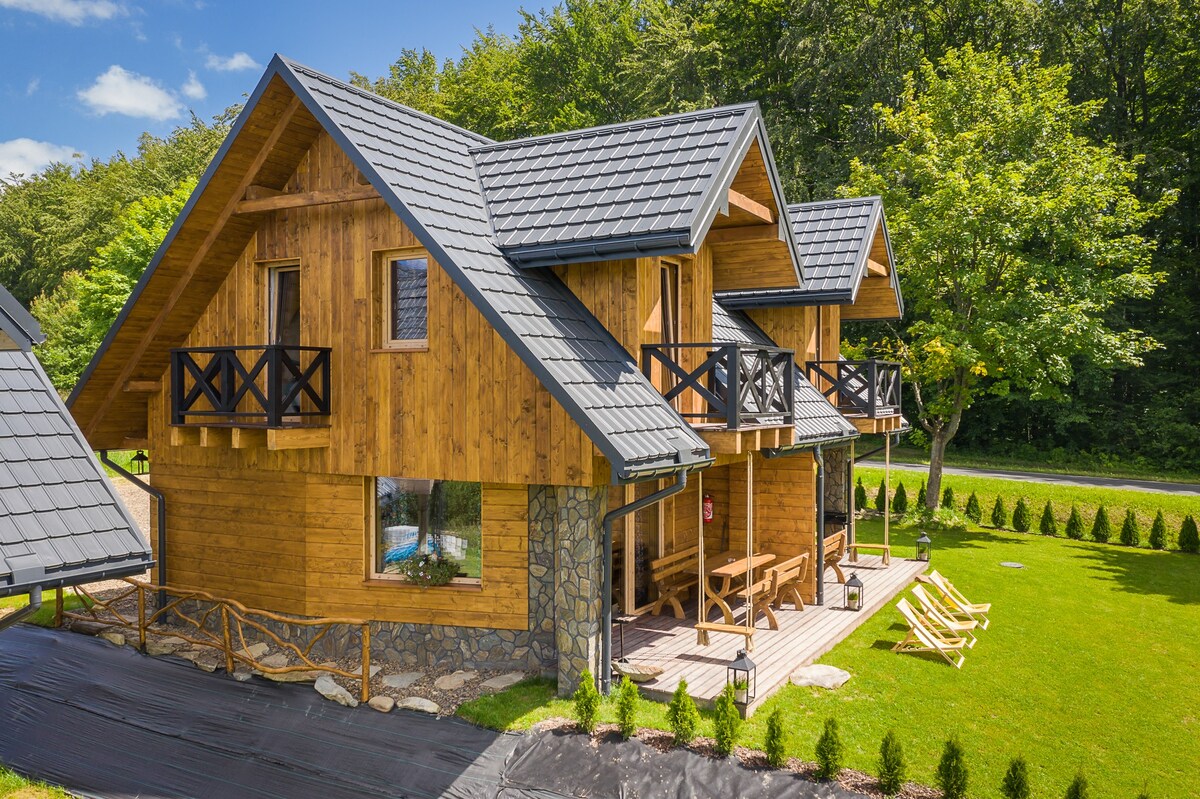 Dwa drewniane domy łączące lokalny styl z nowoczesnością i wiejskim charakterem. Otwarte przez cały rok, każdy podzielony na dwa niezależne apartamenty (48 m² + 15 m² taras), z osobnym wejściem, aneksem kuchennym, salonem, dwiema sypialniami i łazienką. Wszystkie sypialnie posiadają balkon z widokiem na piękną okolicę bukowego lasu lub daleką panoramę Połonina. Na terenie obiektu znajdują się aż dwa place zabaw z trampolinami dla naszych najmłodszych Gości.