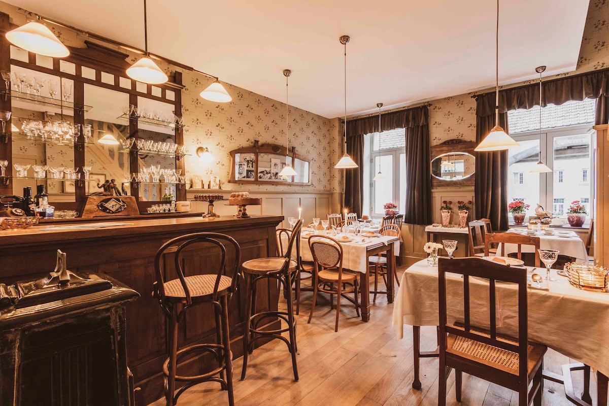 HOSTELLERIE MARIE Charming Art Deco house in Art Deco style A tiro de piedra de Maastricht, pero aún tan belga ... Eben-Emael combina cultura, naturaleza e historia con el encanto sureño de Valonia. Déjate cautivar por el ambiente de la década de 1930 y aún disfruta de la comodidad contemporánea. Nuestros huéspedes pueden usar el jardín. Hay una piscina al aire libre y un jacuzzi. Hay una sala común y una pequeña cafetería de los años 30, aquí también servimos desayuno.