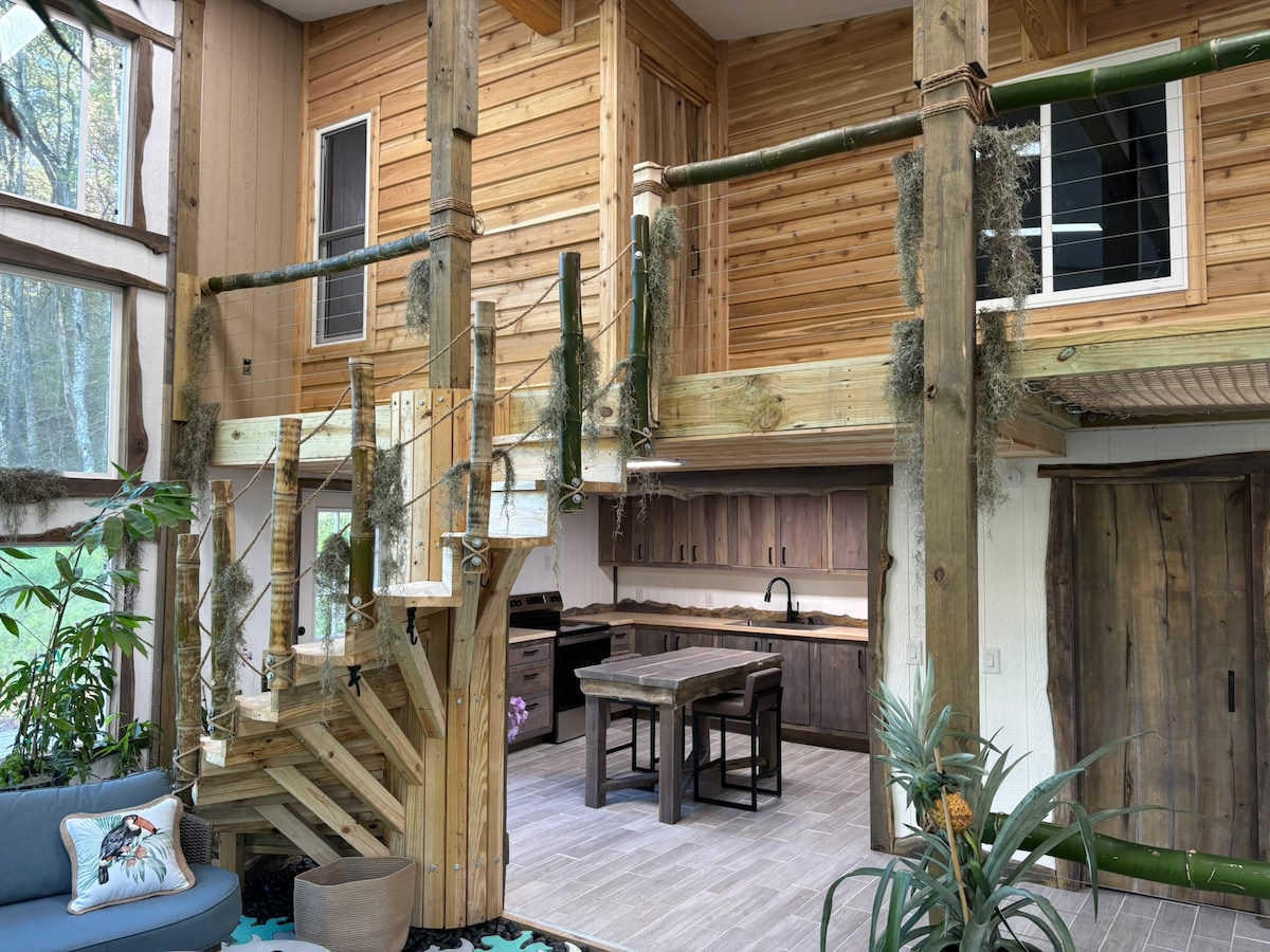 "Ginseng House" - Our premiere off-grid tiny house! A hand-crafted work of art using our own sawmill lumber. Beautiful wooded setting surrounded by 180 acres of private land and two miles of beautiful Buffalo Creek frontage to enjoy. One very comfortable queen bed in the loft and a fold out double bed love seat on the main floor. Extra guests may pitch tents for $10/night/person. Pets welcome - $35/pet - see pet policy.
