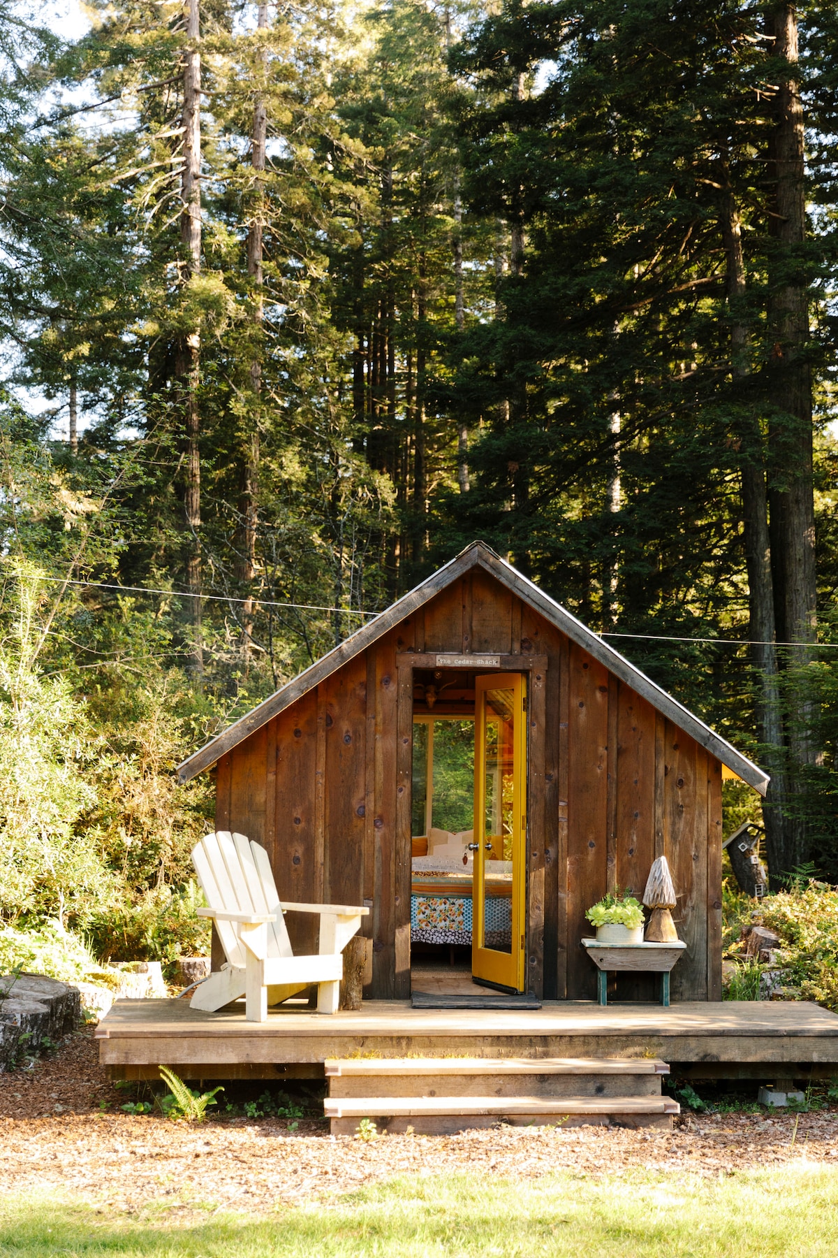 Cozy little guest shack looking out on giant redwoods at our sweet old homestead. Perfect stop on a road trip, just 1.5 miles from HWY 1 and endless coastal adventures. 🛏️ Indoors: Queen sized bed with cozy cotton flannel sheets, down comforter, and fluffy pillows, love seat, pour over coffee set up, small cooler, books galore. ✨No Wifi ✨ 🌲 Outdoors: hot shower with view of the redwoods and open sky, sink, composting toilet greenhouse bathroom about 30 steps from the cabin.