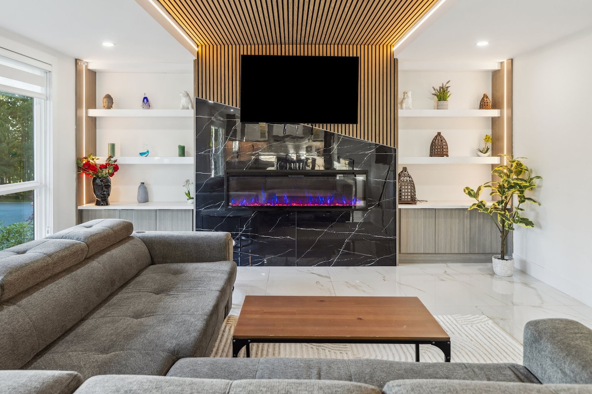 Atraviesa la puerta de cristal y adéntrate en una impresionante obra maestra contemporánea. Nuestro elegante refugio privado es el destino definitivo para que las familias se relajen, con vistas a la bucólica reserva Mackay Creek. Prepara algo delicioso en la amplia cocina de última generación o disfruta de una noche de cine en el espacioso teatro privado, con 7 divanes personales. Cerca del puente colgante de Capilano y de la montaña Grouse. ¡No se permiten fiestas! *Este es un B&B con licencia del distrito de North Vancouver.