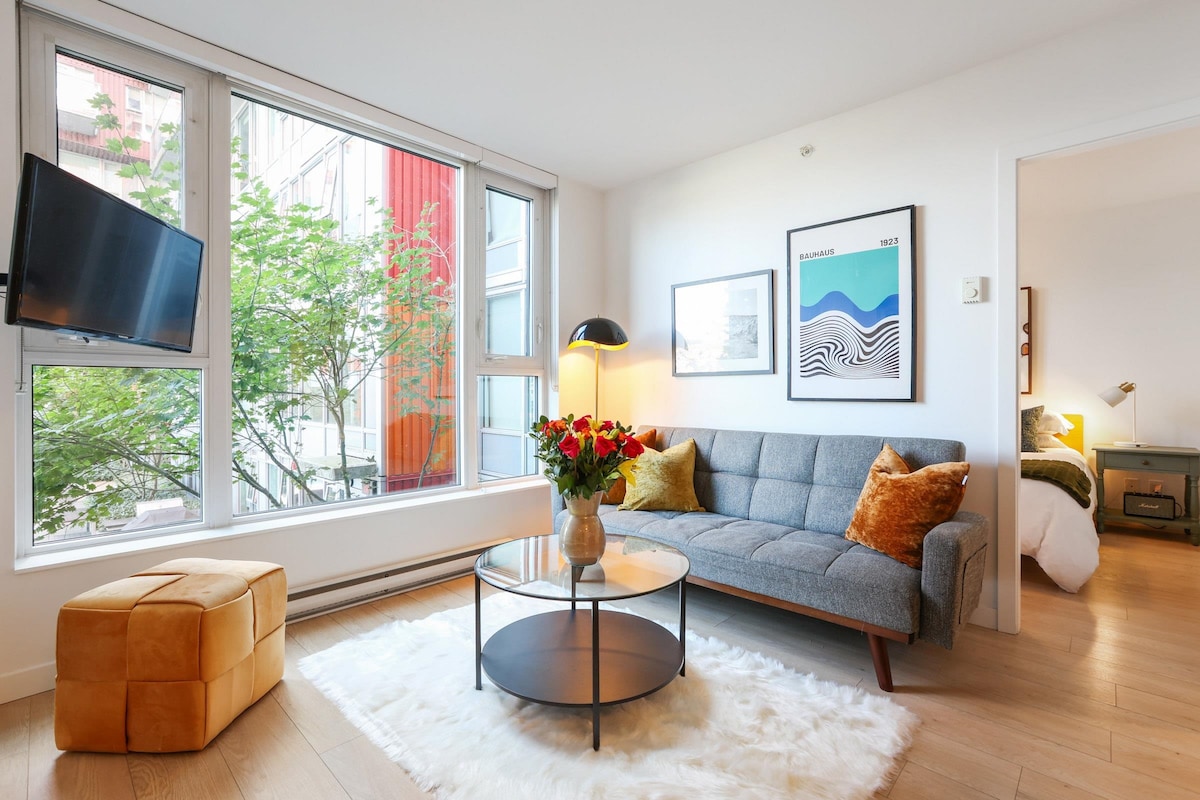 Situado en el corazón del vibrante barrio de Mount Pleasant, en el centro de Vancouver. Este estudio elegante y con estilo está a pocos minutos del centro de la ciudad, de la Universidad Emily Carr y de una gran variedad de tiendas, cervecerías, restaurantes, transportes y vida nocturna. El edificio ofrece varios servicios, como balcón privado, gimnasio y patio compartido en la azotea con vistas a la montaña. Totalmente equipado para garantizar una estancia cómoda. Este moderno apartamento te hará sentir como en casa.