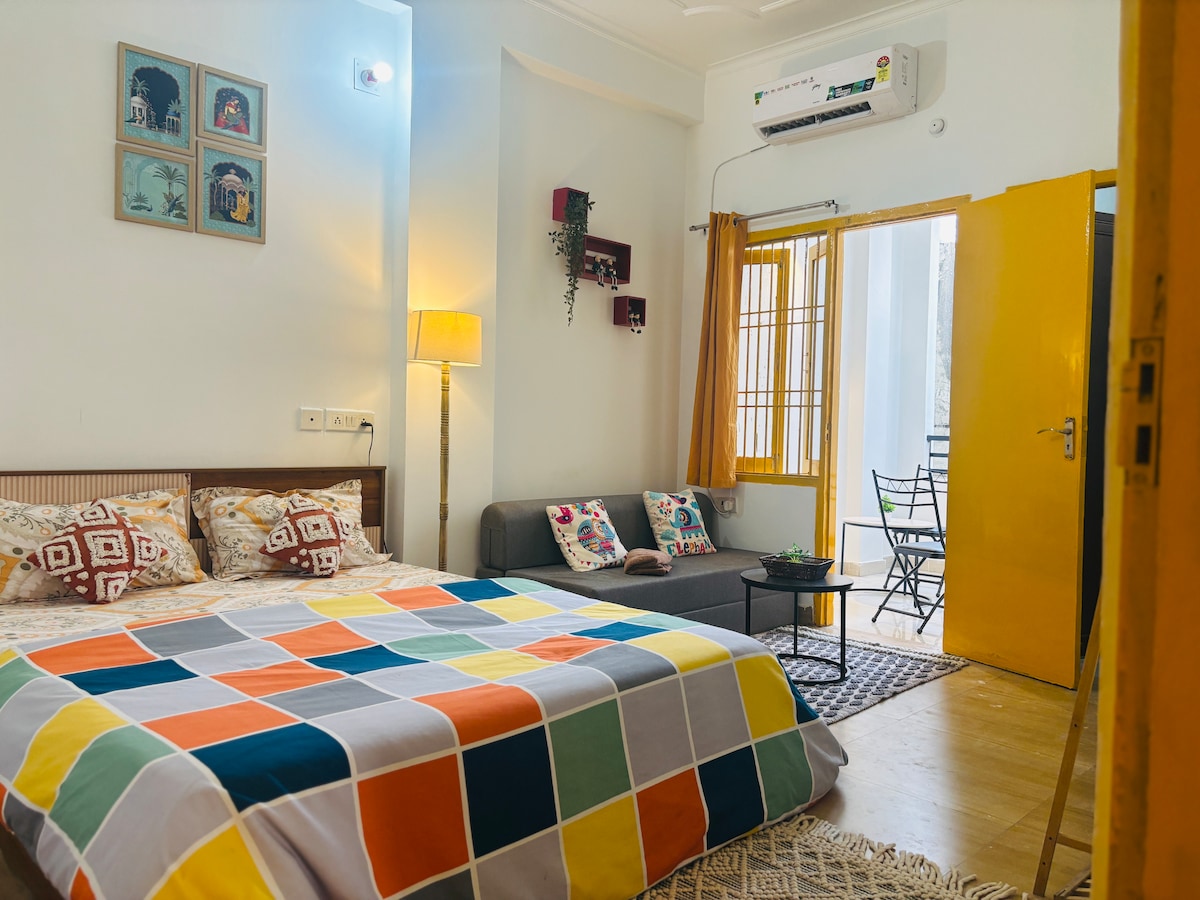 Stay in style at Retro Gram’s 1 bedroom with Balcony and shared spaces-Kitchen and Living area on Second floor(Lift access), where, soft colors, and vintage charm meets It is Budget friendly place for you and your family Just 700 meters from Banaras Railway Station (BSBS) and about 20 minutes’ drive to Assi Ghat, Dashashwamedh Ghat, and Kashi Vishwanath Temple. The property sits inside the posh locality of Varanasi , about a 5-minute walk from the main road.