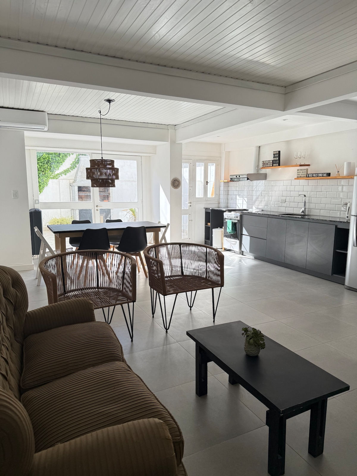 Casa 2 ambientes nueva. Entrada independiente. Espacio para un auto. Emplazada en lote de 450 metros cuadrados, parque y árboles. 1 Dormitorio con cama doble y placard nórdico. Cuarto de Baño completo. Cocina totalmente equipada, heladera con freezer, pava eléctrica y microondas. Living, comedor integrados, super luminoso. Ultimas tendencias en Deco. Smart TV / Wi Fi / Alarma inalambrica. Terraza con parrilla y accesorios en semicubierto.