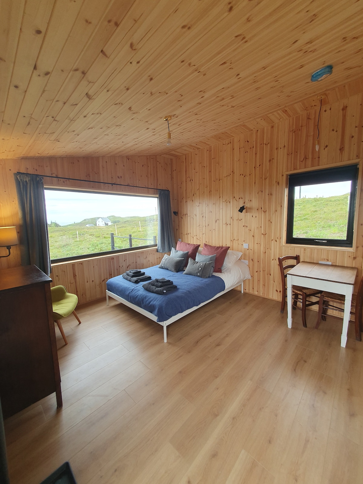 The Tin House is our modern take on a traditional highland bothy. A spacious, open plan living /sleeping space offers all the home comforts you would expect, Large picture windows create a bright space with stunning views over the loch to the mountains. A Deck with locally crafted Adirondack chairs make the perfect place to watch the local wildlife or sit out under our spectacular night sky during the darker nights. Towels and bed linen are included.