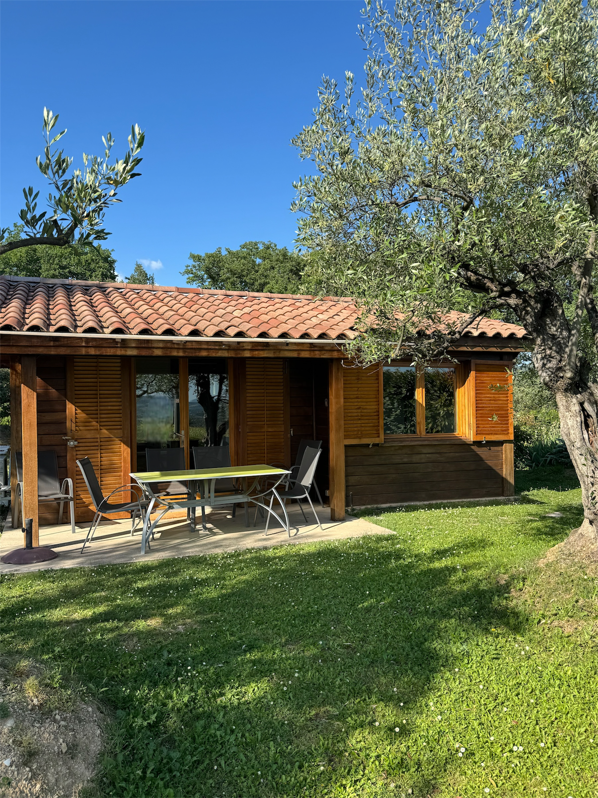 FR2NLVT9 En Provence, en el Lubéron, cerca de Aix en Provence, la naturaleza con las Gargantas del Verdon, chalet de 40 m², 4 personas. Piscina privada cubierta con una cúpula, estacionamiento, campo de badmington y petanca. Habitación principal con cocina, sofá cama, TV sobre parábola, lavavajillas, nevera, congelador, horno multifunción, 2 dormitorios, baño, 2 aseos, gran terraza con muebles de jardín a la sombra debajo de un cenador, aire acondicionado, WiFi, SPA bajo cenador