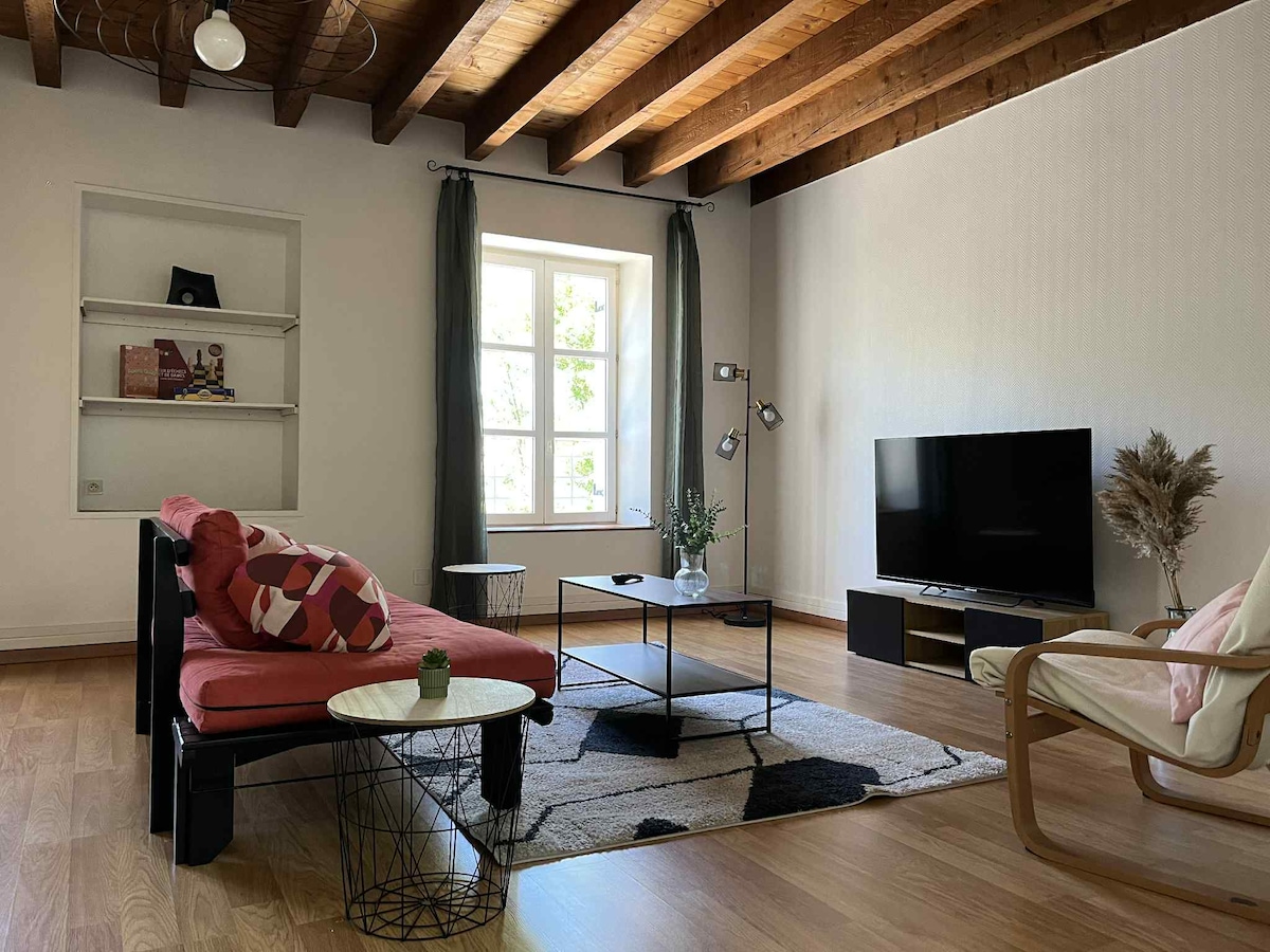 Nous avons entièrement rénové notre appartement en plein centre ville pour en faire un espace chaleureux et agréable à vivre. Tout est pensé pour votre confort : un salon accueillant, une cuisine équipée, une chambre avec une literie confortable et une salle de bain moderne. Vous y trouverez tout le nécessaire pour un séjour sans souci : WiFi, machine à laver, sèche-cheveux… Que vous soyez en voyage ou en déplacement, nous serons ravis de vous accueillir !
