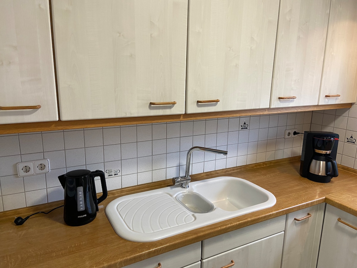 En el piso 1 de nuestra casa ofrecemos un apartamento de unos 28 m². En la parte de arriba se debe utilizar una escalera. En la sala de estar, además de la televisión, también hay juegos y libros disponibles. La cocina contiene microondas y nevera, así como hervidor de agua y cafetera . El baño con ducha e inodoro está equipado con ropa de baño. Además de la conexión por carretera cercana, las afueras de la casa ofrecen buenas oportunidades para andar en bicicleta y hacer senderismo, por ejemplo, al parque de vida silvestre vecino.
