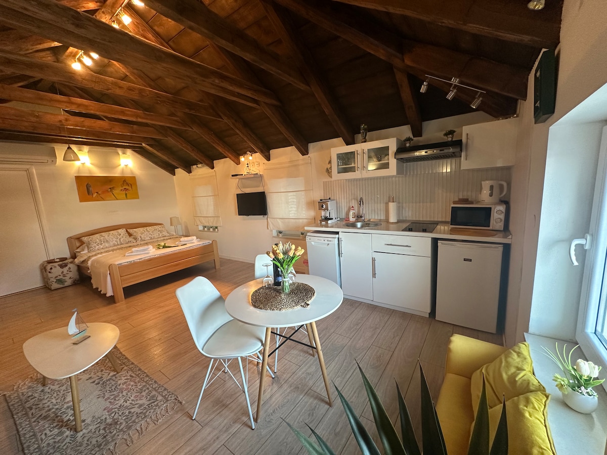 «Laganini» significa coloquialmente en Dalmacia: baja el ritmo, disfruta de la vida, relájate, olvídate del tiempo y de todas las obligaciones. Por eso te invitamos a nuestro loft en el ático, reformado con mucho gusto. En un total de 60 metros cuadrados, te espera un diseño bien pensado, un estilo de decoración moderno, mucho romanticismo y un toque de lujo, enmarcado por antiguos muros de piedra natural. Siéntate y disfruta de las vistas al mar, las montañas circundantes y los tejados del casco antiguo de Varoš.