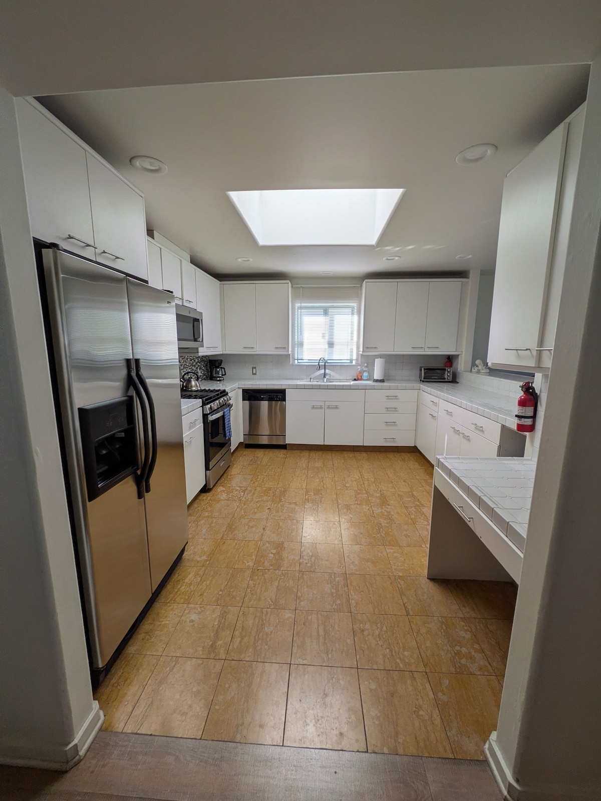 Contempla la puesta de sol desde la azotea de esta joya arquitectónica moderna. Relájate junto a una cascada zen en un espacio de diseño industrial fluido de interior a exterior con puertas de vidrio del patio del suelo al techo, dos fogatas y decoración y arte coloridos. Los niños menores de 18 años no cuentan en el límite de ocupación publicado, por lo que, por ejemplo, se permitirían 8 adultos más varios niños. Hay cuatro camas plegables portátiles de primera calidad que no se muestran en las fotos y que caben en cualquiera de los espaciosos dormitorios o en la sala de estar, lo que eleva el total de camas a 9. URBAN LOFT es como se siente la «sala de estar». Perfecto para grupos grandes y eventos porque toda la planta baja es un gran espacio abierto (aproximadamente 1000 pies cuadrados). La mitad del espacio está abierto y se puede configurar con mesas, esterillas de yoga y asientos. El sofá extragrande y las otomanas tienen capacidad para diez personas y están frente a un televisor de pantalla plana grande y una chimenea de gas. Las enormes puertas correderas de vidrio se abren a un gran patio privado y cuentan con muebles personalizados con capacidad para diez personas y rodean un pozo de fuego de gas. La COCINA DEL CHEF cuenta con una cocina Viking de 6 quemadores y todo el equipo de cocina que puedas necesitar, vajilla para 12 personas, con mucho espacio para chefs y proveedores de comida. La mesa de comedor tiene capacidad para diez personas y hay dos mesas plegables y sillas disponibles para ampliar la capacidad en ocho. ¡Abre las puertas correderas de vidrio y escucha los relajantes sonidos de una pared de agua zen! Dos barbacoas de carbón tradicionales abovedadas Weber de 22” para asar a la parrilla. SISTEMAS DE ENTRETENIMIENTO: Hay televisores grandes de pantalla plana en la sala de estar, la suite principal y el dormitorio delantero de invitados, e incluyen cable y contenido premium. Transmite tu propio contenido o reproduce tu biblioteca de Apple a través de Apple TV en el sistema de la sala de estar. Para presentaciones de PowerPoint o cualquier contenido reproducido en tu ordenador portátil, puedes conectar tu ordenador portátil al televisor mediante un cable HDMI (trae el tuyo propio). Para la música, el gran Bose Sound Dock está en la sala de estar. Reproduce tu música a través de dispositivos habilitados para Bluetooth. También hay canales de música disponibles en DirecTV. ¡El DORMITORIO PRINCIPAL es lo suficientemente grande como para ser un apartamento! Cuenta con baño privado con bañera con profundidad, balcón privado, sala de estar separada con TV y sofá, y silla colgante de burbuja (lugar ideal para #instagram). LOS DOS DORMITORIOS DE INVITADOS comparten un baño. Dos camas tamaño queen están en una, una cama tamaño king y dos camas individuales en la otra. Las opciones para dormir son flexibles; mueve cualquiera de las cuatro camas plegables portátiles a cualquiera de los dormitorios, o incluso a la sala de estar. Para que quede claro, hay tres dormitorios privados y la casa funciona mejor para grupos grandes que son flexibles en sus arreglos para dormir. Los números de capacidad suponen que dos personas compartirán las camas tamaño queen y king. . Los BEBÉS Y NIÑOS PEQUEÑOS son bienvenidos, y tengo una cuna portátil y dos sillas altas. Pero, ten en cuenta la siguiente sección sobre las escaleras: ESCALERAS: La casa es de construcción moderna y tiene largas escaleras de hormigón y acero que conectan la sala de estar con el nivel del dormitorio de arriba. Estas pueden ser una preocupación para las personas mayores o para los niños muy pequeños o rebeldes. Hay una puerta de seguridad disponible para la parte superior de las escaleras principales, que se instala bajo petición. La TERRAZA DE LA AZOTEA es una terraza totalmente privada en el tercer piso, con vistas de 270 grados, un vistazo al letrero de Hollywood, tumbonas para cuatro personas, sofá para diez personas, todo ello alrededor de un pozo de fuego de gas. Es un lugar estupendo para tomar el sol y pasar el rato, ver la puesta de sol o beber cócteles junto al fuego. Debido a las restricciones de ruido, no se permite el uso de huéspedes después de las 22:00 horas. APARCAMIENTO: Caben dos coches en la entrada. También tienes uso exclusivo de dos plazas de aparcamiento más en la calle, paralelas a la puerta del garaje. (Excepto el martes por la mañana de 8:30 a 10:30, horario de barrido de la calle). En general, este barrio tiene un amplio estacionamiento en la calle, excepto durante los fines de semana de verano o los días cálidos de invierno. Durante esos momentos, cualquier coche que supere los cuatro puede aparcar (incluso durante la noche) en los aparcamientos públicos cercanos: el número 9 en 14031 Palawan Way o el número 13 en 4601 Via Marina, en Marina Del Rey. AUTOREGISTRO: La casa cuenta con una cerradura electrónica en la puerta principal. Dos días antes de tu llegada te enviaré el código que la desbloquea y podrás entrar en cualquier momento después de las 16:00 h del día de tu llegada (o de las 13:30 h para dejar el equipaje). Las instrucciones de la casa y las contraseñas del wifi están publicadas en la cocina. LLEGADA ANTICIPADA y SALIDA DESPUÉS DE LA HORA ESTABLECIDA Esta es una solicitud frecuente y, dado que la casa está alquilada casi al 100 %, generalmente es imposible de aceptar. La casa tarda cinco horas en limpiarse entre la salida a las 11:00 y la llegada a las 16:00. Sin embargo, si no te importa ver una casa desordenada, puedes dejar el equipaje después de las 13:00 h. Del mismo modo, si vas a salir y tienes un vuelo tarde, puedes dejar el equipaje junto a la puerta principal hasta las 12:30 h. REQUISITO DE ESTANCIA MÍNIMA. Recibo muchas más solicitudes de alquiler de las que puedo manejar. Necesito llenar todas las noches de la semana, así que tengo algunas pautas que determinan qué solicitudes de alquil