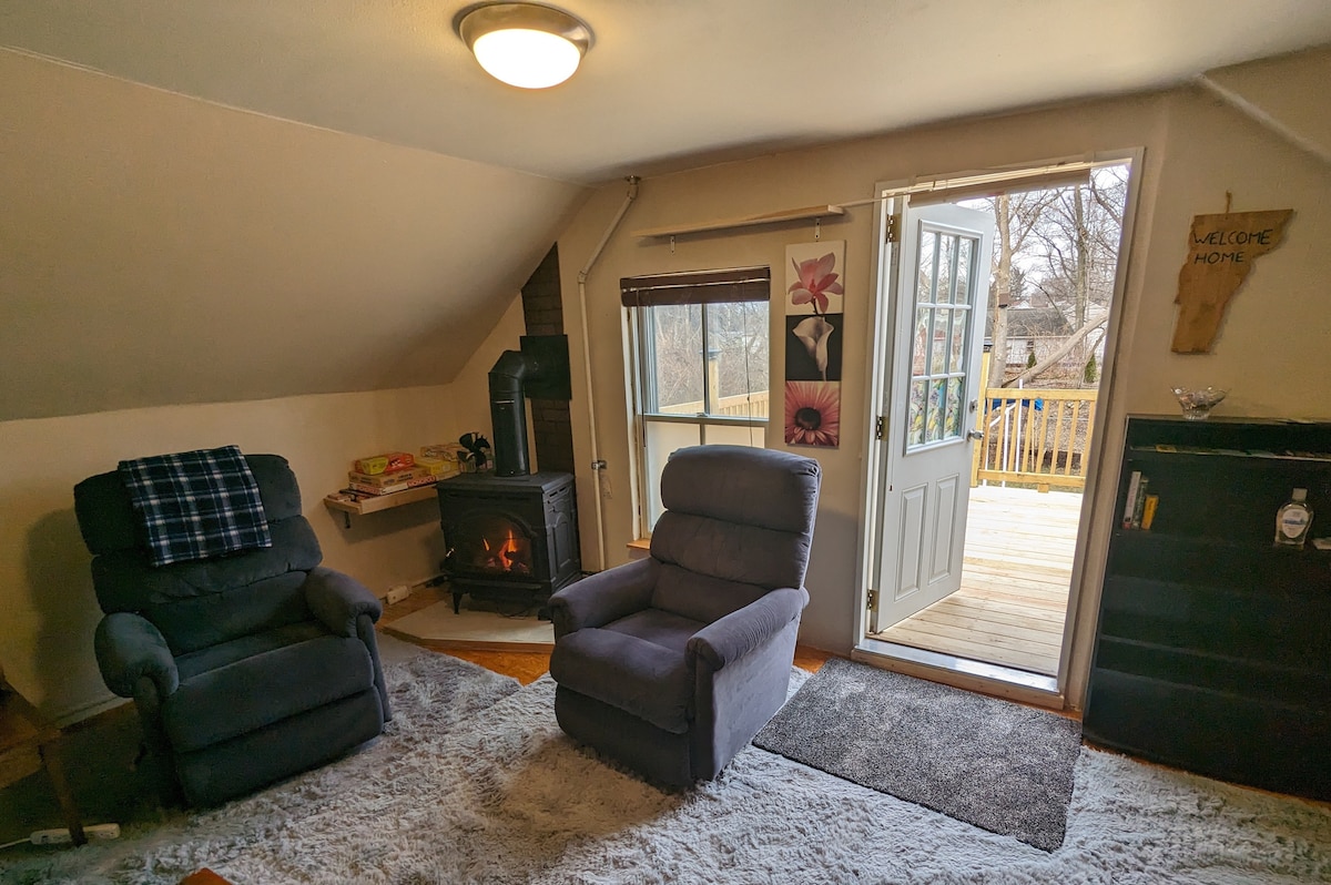 Relájate en este acogedor estudio que se encuentra en las colinas de la hermosa Duxbury Vermont. ¡Se ofrece durante todo el año para que nuestros huéspedes puedan disfrutar de todo lo que Vermont tiene para ofrecer, como esquí, cambio de hojas, senderismo y mucho más! Los huéspedes disfrutarán de su propio espacio privado con acceso a muchas comodidades, como una cocina completa, entrada privada, una cama tamaño queen, wifi gratuito y mucho más. ¡Así que coge una taza y siéntate a relajarte junto a la chimenea de gas! ¡Querrás volver cada temporada!