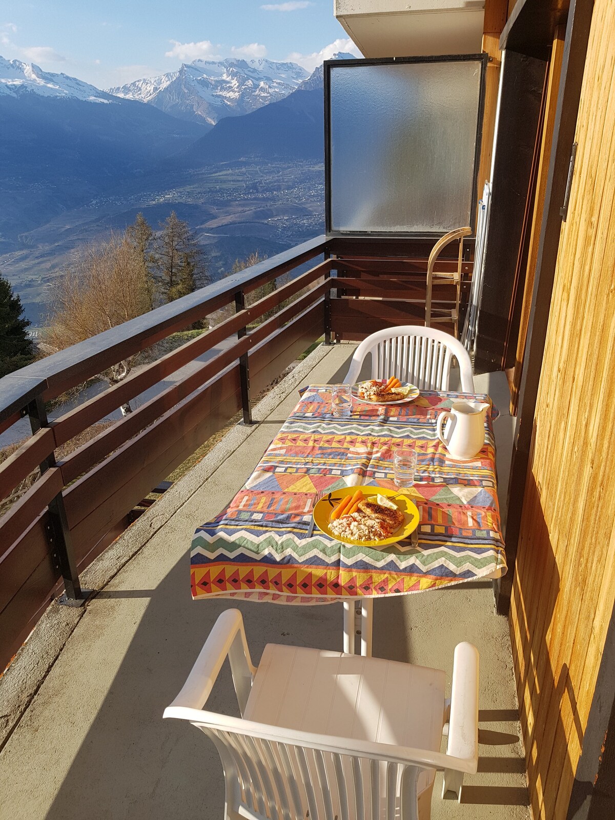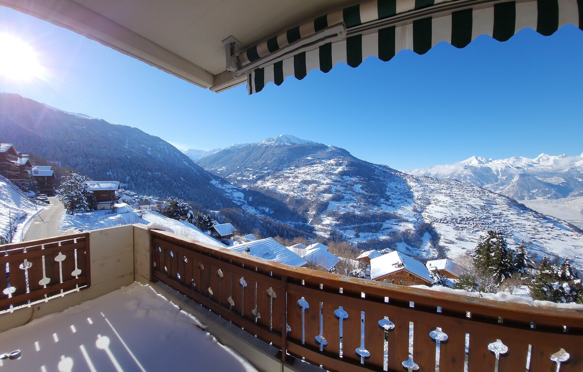 ¡Ubicación de ensueño! ¡1450 m de altitud! ¡La mejor vista de Suiza! ¡La mejor relación calidad-precio! Enorme zona de esquí (4 Vallée/Verbier): más de 400 km de pistas. ¡Telesilla a 3 minutos a pie! Para 2 familias = 4 dormitorios, 2 baños. En el centro: ¡restaurantes, bares y supermercado al otro lado de la calle! ¡Aparcamiento gratuito propio! ¡Café gratis! Panorama surrealista tanto de día como de noche para disfrutar desde la sala de estar y el jardín: montañas, glaciares, lagos, valles, río, aeropuerto, autopista, ferrocarril, iglesia, viñedos, ciudad, pueblos.